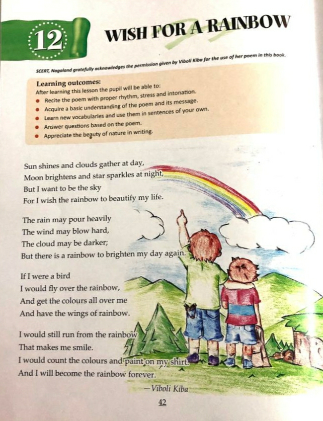 The colorful words and objects like rainbow, sun, moon, star, clouds, wind, rain , bird, wings, paint, shirt are used to let the students picturize the poem.